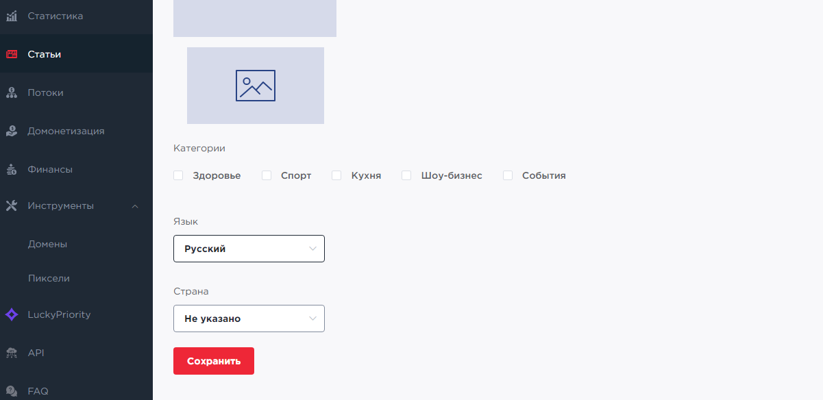 Также загружается изображение-обложка и указывается категория, релевантная сути новости, язык и страна, на аудиторию которой она рассчитана.