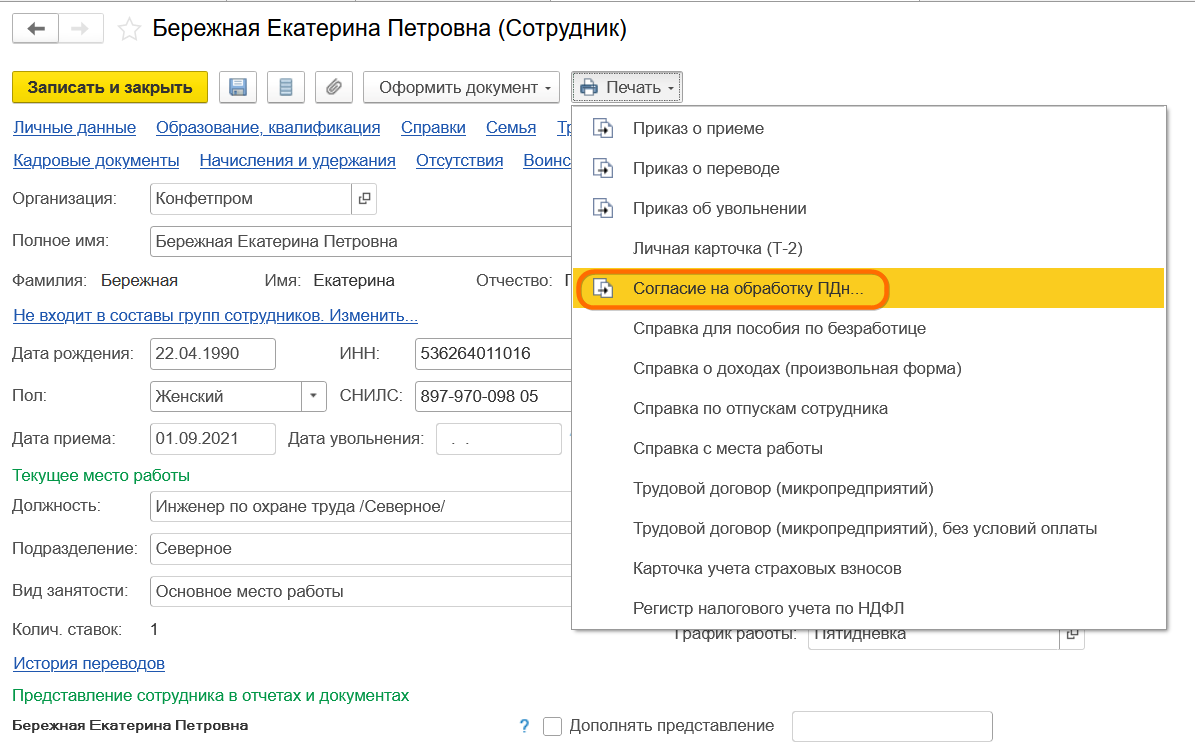Обратите внимание, что как в справочнике Физические лица, так и в карточке сотрудника по кнопке Печать есть печатная форма, которая на деле еще и документ программы, который выполняет определенную функцию: Согласие на обработку ПДН (согласие на обработку персональных данных). При создании нового физического лица не забывайте данный документ провести, так как его наличие необходимо для корректного обмена личными данными сотрудника, например, при синхронизации ЗУП и Бухгалтерии.