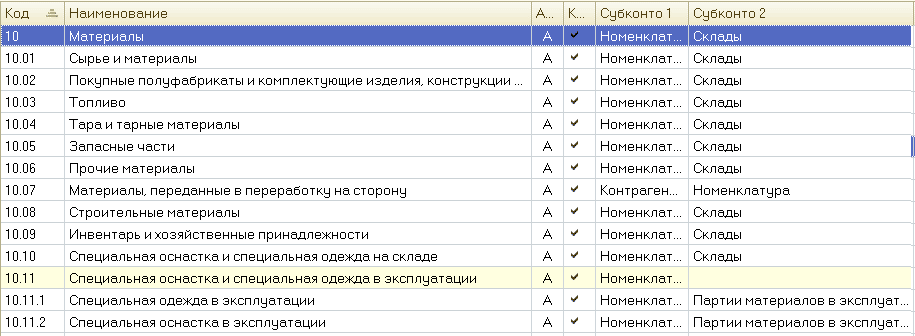 Каждый субсчет предназначен для группировки отдельных видов материалов.