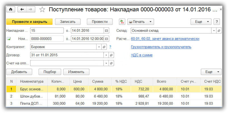 Документ выполняет проводки бухучета в Дт счета 10, а также, для организации — плательщика НДС, в Дт 19.03 («НДС по приобретенным МПЗ»). Доступна печать приходного складского ордера (М-4).