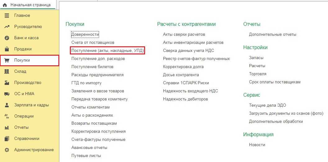 Для этого перейдём в раздел «Покупки» и выберем пункт «Поступление (акты, накладные, УПД)». В открывшемся окне нажмём на кнопку «Поступление» и из выпадающего меню кликнем на «Услуги (акт, УПД)».