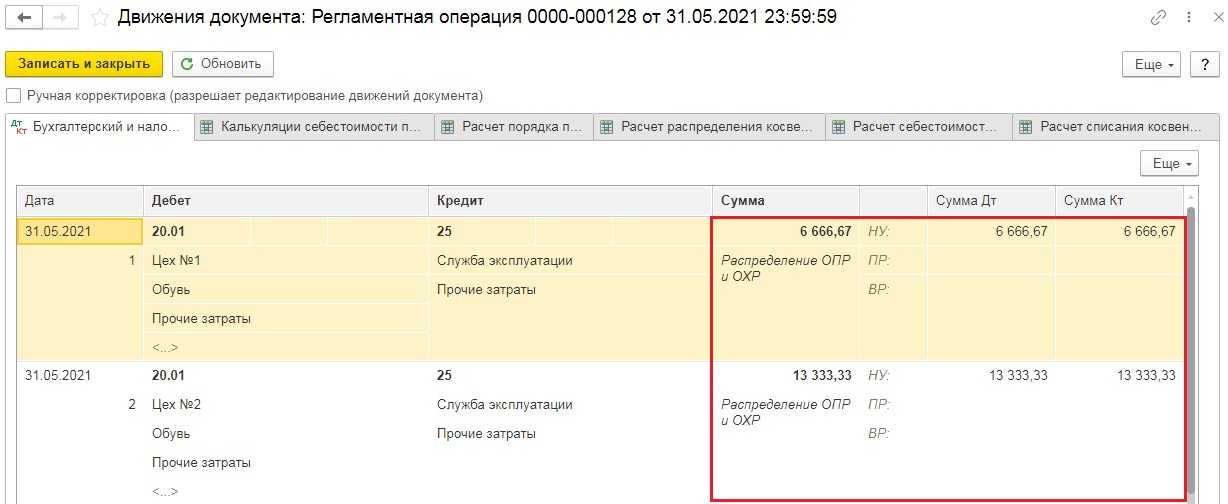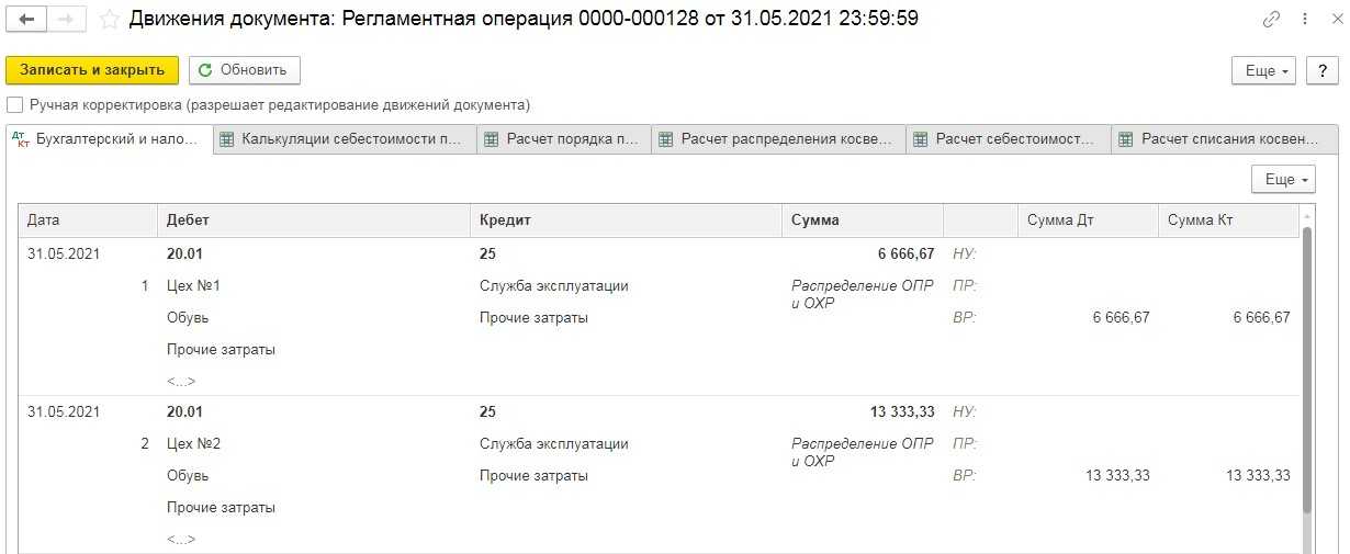 В проводках мы увидим, что сумма затрат на 25 счёте (в нашем примере 20 000 рублей) была распределена по цехам пропорционально начисленной заработной плате. Проверить это легко, нужно 20 000 рублей поделить на 3, чтобы получить сумму для Цеха № 1 и умножить на 2/3, чтобы рассчитать сумму для Цеха № 2.