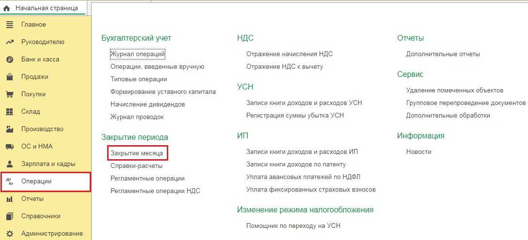 Получается затраты на 25 счёте будут распределяться на 20й в пропорции 1/3 и 2/3. Перейдём в раздел «Операции» и выберем пункт «Закрытие месяца».