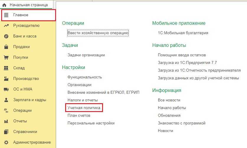 Обратимся к настройкам учётной политики («Главное» — «Учётная политика»).