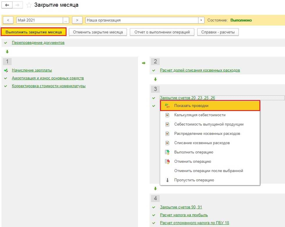 В открывшемся окне выберем нужный нам месяц и нажмём на кнопку «Выполнить закрытие месяца». Когда все пункты обработки будут выполнены (шрифт станет зелёного цвета), нажмём на операцию «Закрытие счетов 20, 23, 25, 26» и в новом окошке выберем «Показать проводки».