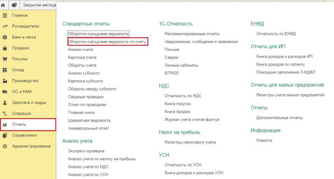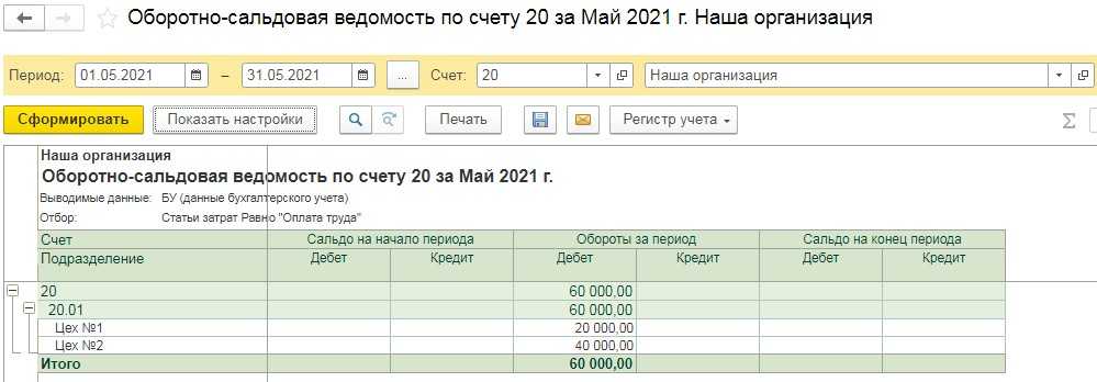 Прежде чем переходить к закрытию месяца посмотрим и проанализируем базу распределения расходов. Сформируем оборотно-сальдовую ведомость по счёту 20 с отбором по статье затрат «Оплата труда» в разрезе подразделений. Для этого перейдём в раздел «Отчёты» и выберем пункт «Оборотно-сальдовая ведомость по счёту».