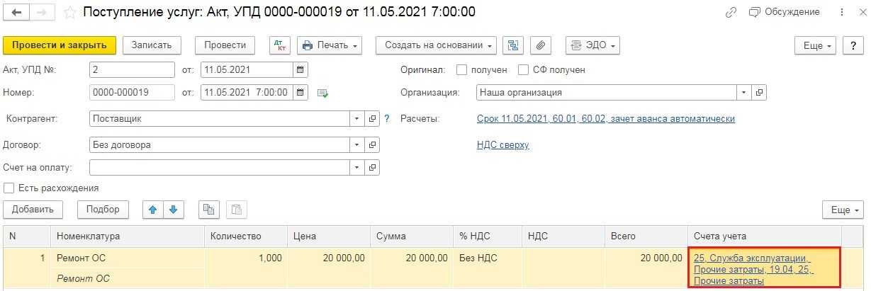 В новом документе введём данные из акта: номер, дата, наименование контрагента, договор. Затем в табличную часть документа добавим строку с услугой «Ремонт ОС» и отнесём её на 25 счёт. Проведём документ.