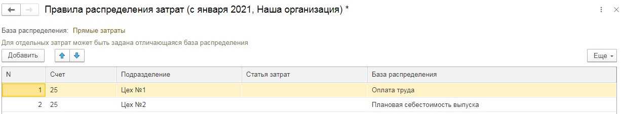 При этом некоторым организациям нужно, чтобы затраты подразделений, например, Цеха № 1 распределялись относительно оплаты труда, а Цеха № 2 — по плановой себестоимости выпуска.