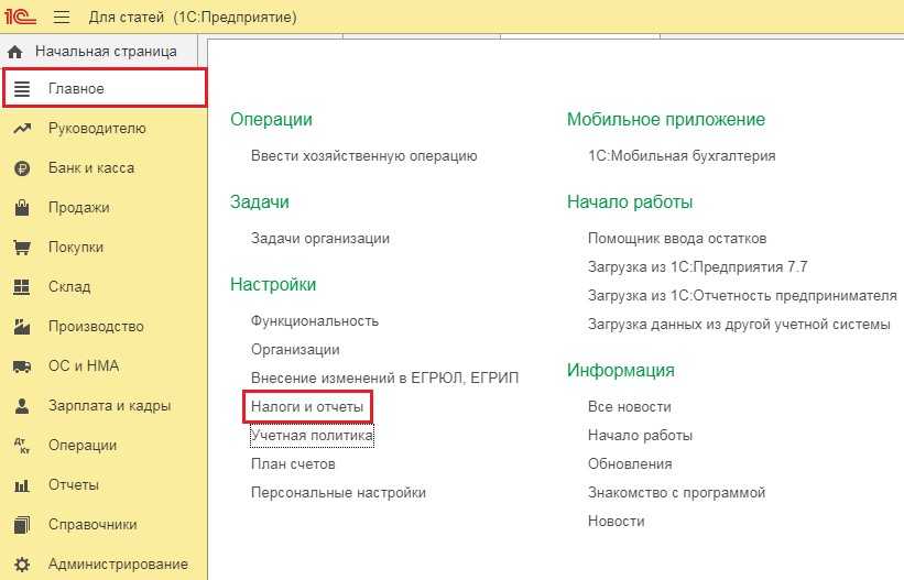 Для того, чтобы программа закрывала 25 счёт в налоговом учёте, также, как и в бухгалтерском, перейдём в раздел «Главное» и выберем пункт «Налоги и отчёты».