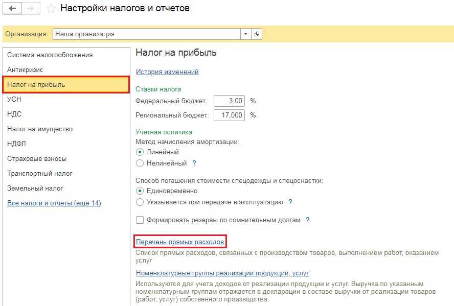 С бухгалтерским учётом разобрались. В налоговом же учёте распределение затрат происходит благодаря настройке перечня прямых затрат, который мы рассматривали выше.