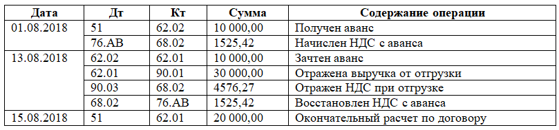 01.08.2018 ООО «Принцип» получило аванс на расчетный счет за предстоящую отгрузку товаров от ООО «Пир» в размере 10 000,00 руб., в т. ч. НДС 18% — 1525,42 руб.