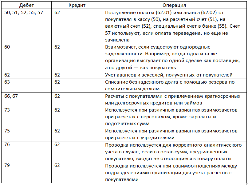 62 счет бухгалтерского учета обычно дебетуется на суммы предъявленных расчетных документов в корреспонденции с кредитом счетов 90 «Продажи», 91 «Прочие доходы и расходы», а кредитуется на суммы полученной оплаты в дебет счетов 50 «Касса», 51 «Расчетные счета» и др.