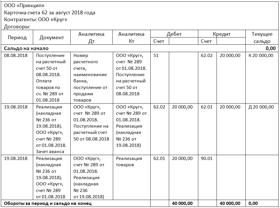 Аналитический учет следует организовать таким образом, чтобы при формировании карточки или оборотно-сальдовой ведомости по счету 62 можно было получить информацию о взаиморасчетах и размерах дебиторской и кредиторской задолженности в разрезе: