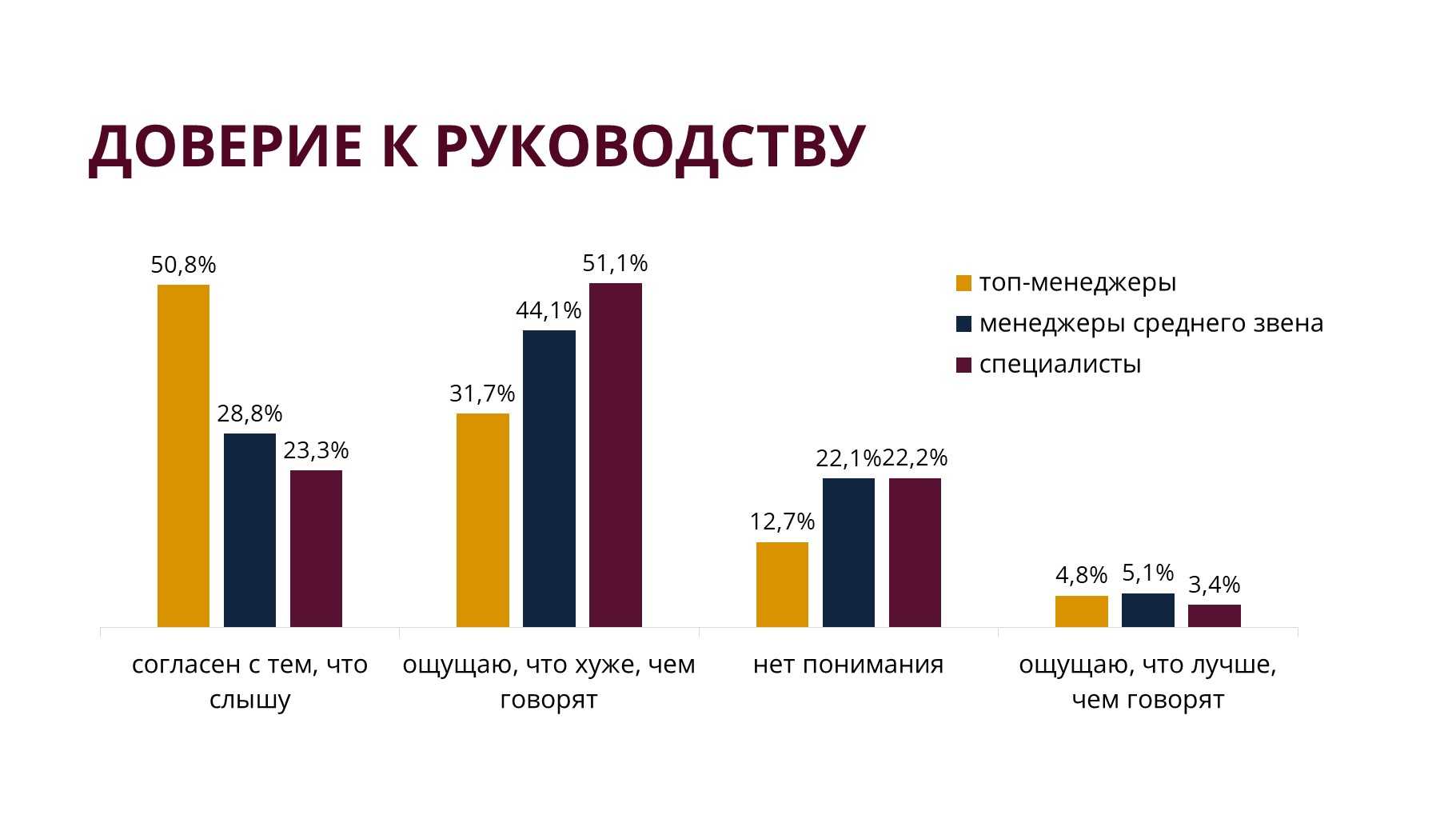 - Менеджеры среднего звена по большей части не доверяют словам руководства (44%), 29% согласны с тем, что слышат, и 22% не имеют понимания ситуации.