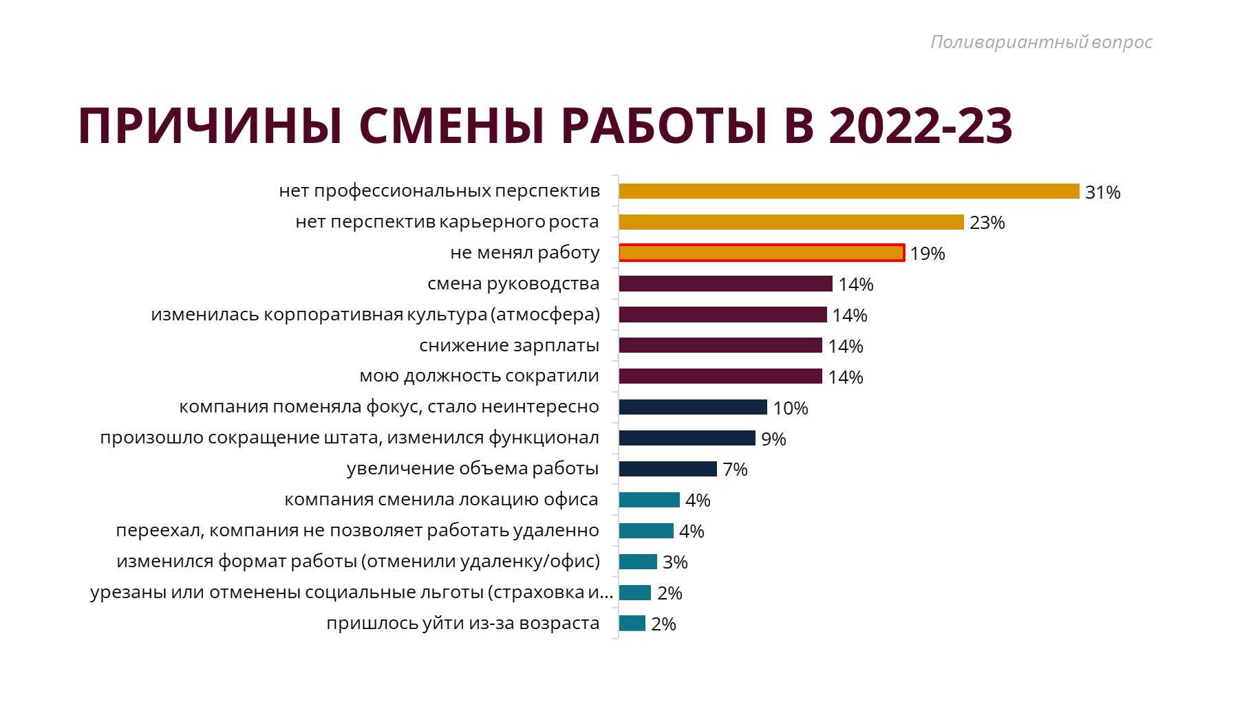 Среди причин смены работы сегодня в безусловных лидерах отсутствие карьерных и профессиональных перспектив. Стоит отметить, что всего 3-4% покидают компанию, потому что работодатель не поддерживает удаленный формат.