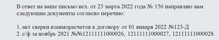 - собственно перечисление направляемых документов. Опционально указывается количество листов в документах;
