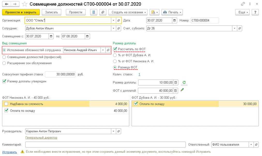Сотрудник ООО «Стиль» А.И. Дубов с должностным окладом 30 000 руб. в период с 30.07.2020 по 07.08.2020 исполняет обязанности временно отсутствующего сотрудника А.И. Никонова с должностным окладом 40 000 руб. В этот период А.И. Никонов находится в отпуске. В соответствии с приказом руководителя организации на период замещения сотруднику производится доплата разницы в окладах.