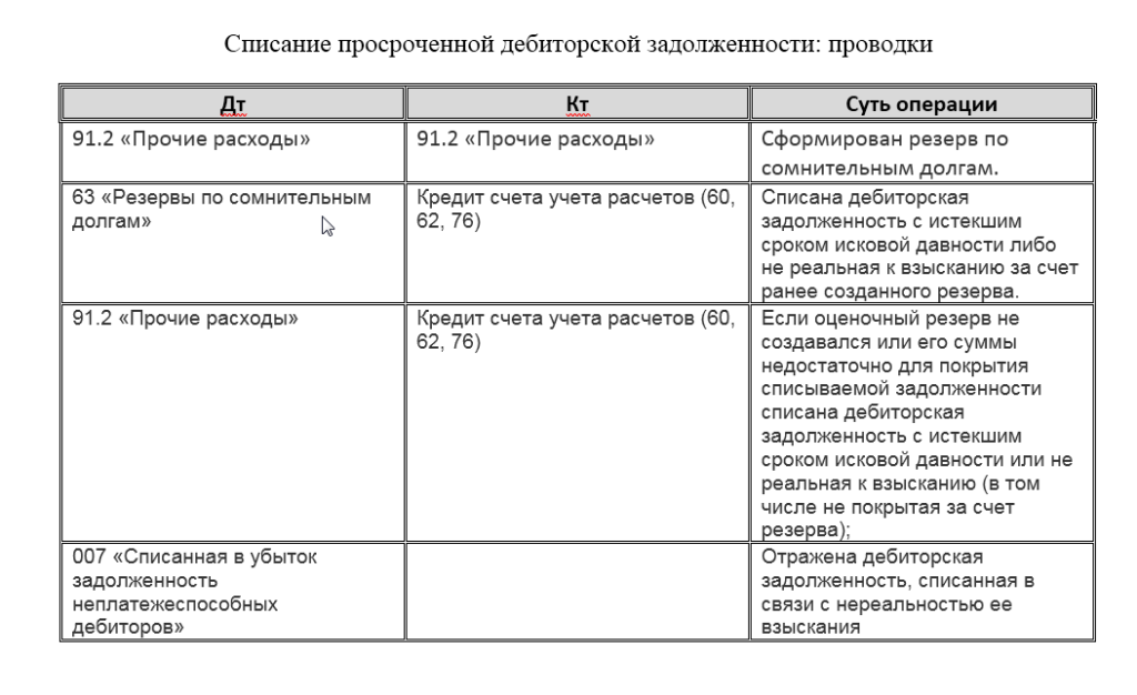 Операция по списыванию долга с истекшим сроком давности отображается такой проводкой: Дт 60 (62, 66, 67, 70, 71, 76) Кт 91 субсчет «Прочие доходы» Запись выполняется на момент утверждения итогов проведенной инвентаризации в отчетном периоде, когда истек давностный срок. Основанием выступают результаты инвентаризации, письменное обоснование причин списания и соответствующий приказ