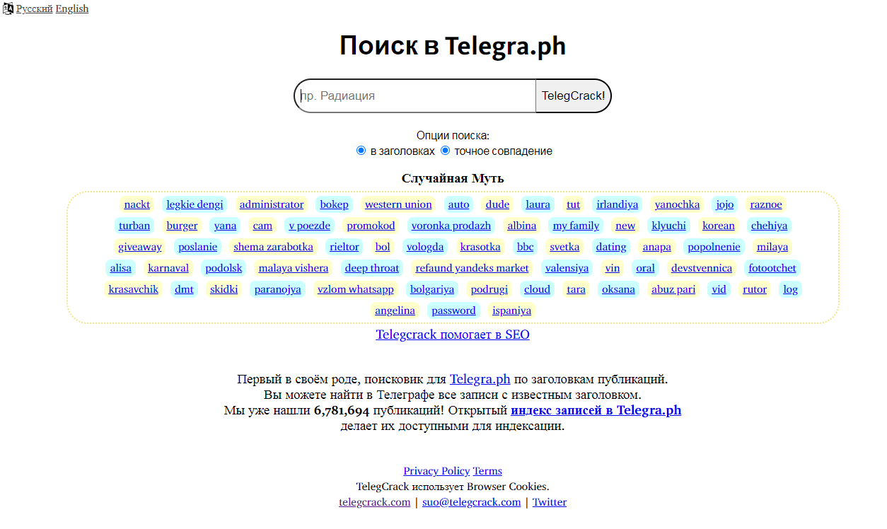 Ну и не следует забывать о поисковике telegcrack.com, который ищет по заголовкам публикаций на сайте Telegra.ph. Этот инструмент больше полезен для сеошников, чем для исследователей вроде нас, но пренебрегать им все‑таки не стоит.