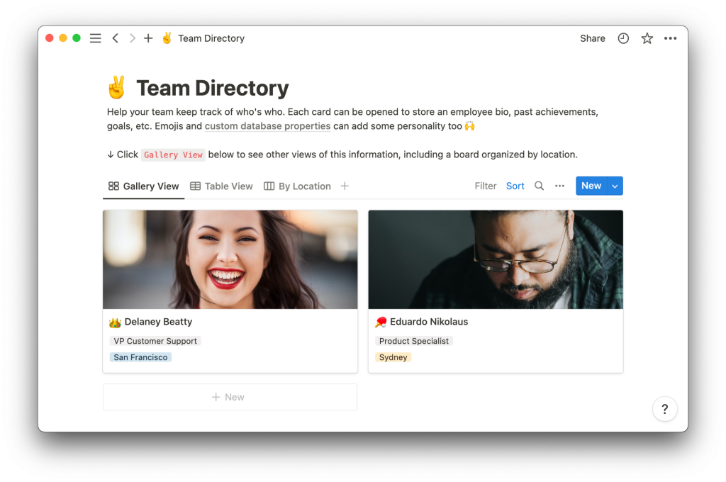 В Notion перейдите от таблицы к галерее, чтобы увидеть сетку фотографий сотрудников. Опять же, обращайтесь к сотрудникам напрямую, чтобы они могли предоставить одобренную ими фотографию. Добавление фотографии упрощает навигацию по каталогу и дает возможность каждому показать себя.