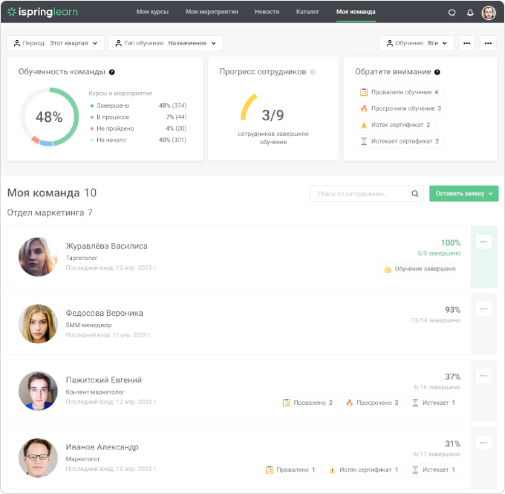 Контроль прохождения курсов сотрудниками в системе iSpring Learn