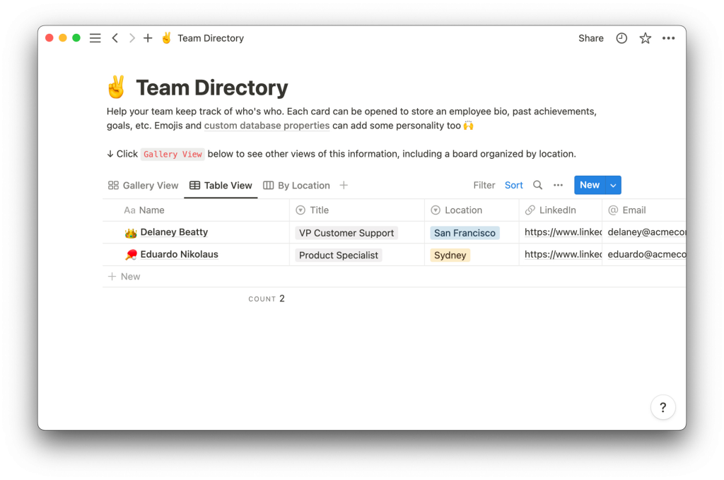 Одна из главных причин, по которой необходимо создавать справочник сотрудников, – это помощь в налаживании контактов между коллегами. С учетом этого сделайте каталог доступным и легко находимым для всех сотрудников. Если вы уже используете систему Notion для обмена знаниями и документацией, вы можете интегрировать данные каталога непосредственно в рабочее пространство вашей команды.