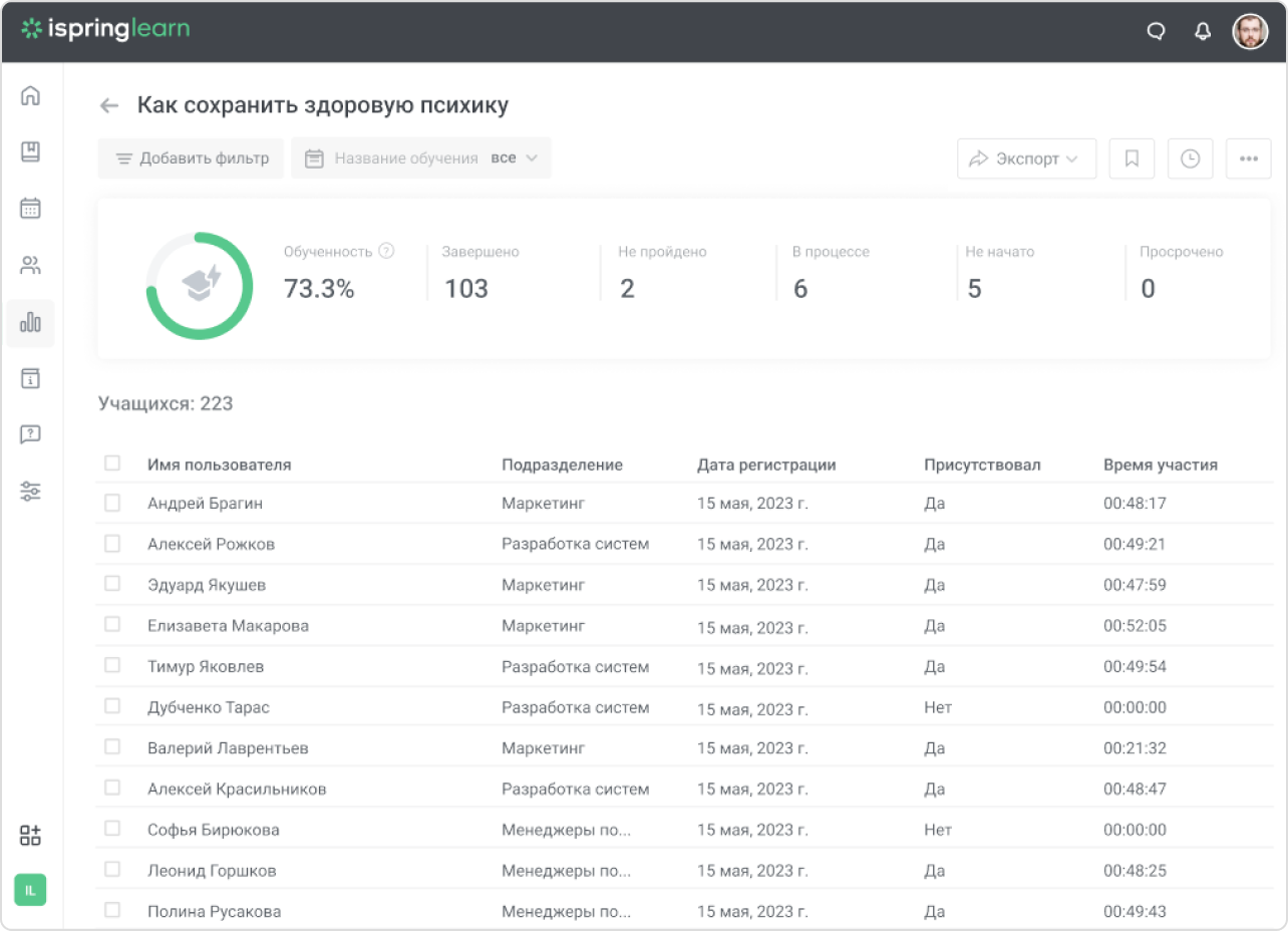 Автоматизирует контроль выполнения. В системе в любой момент можно посмотреть, кто прошел какой-либо курс, а кто не приступал к нему. iSpring Learn отображает сроки выполнения и прогресс каждого сотрудника.