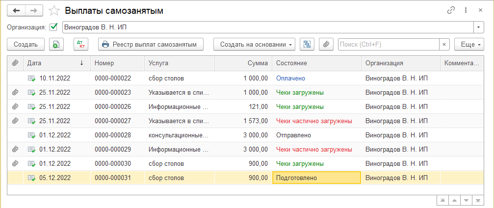 В учетной системе используются следующие состояния для документов Выплаты самозанятым: