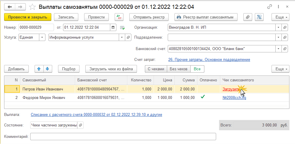Чеки загружены – статус назначается, когда в документ Выплаты самозанятым были загружены чеки всех самозанятых.