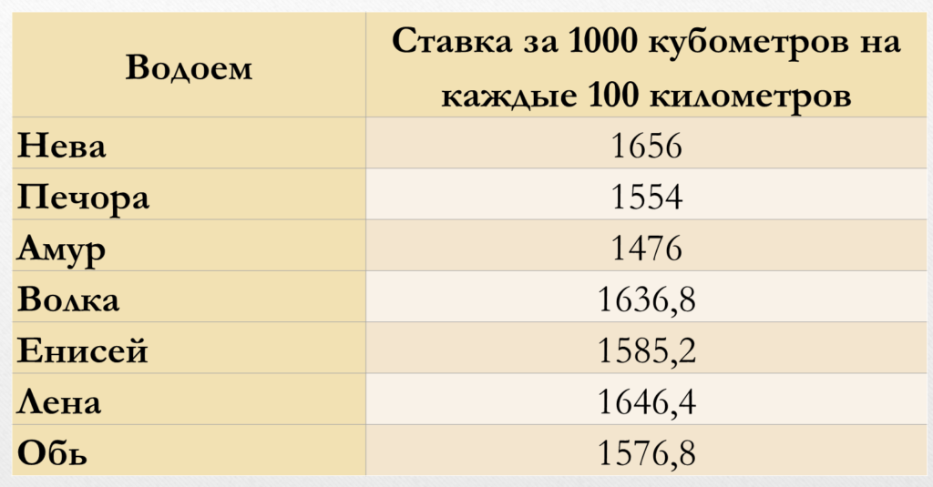 - При сплаве древесины учитывается объем груза (на каждые 1000 кубометров) и расстояние (на каждые 100 километров), которое он преодолел по акватории.