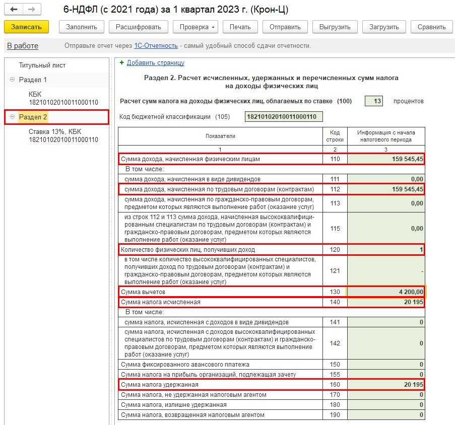 Рис. 6. Заполнение Раздела 2 расчета 6-НДФЛ (с 2021 года) за I квартал 2023 года в программе «1С:Зарплата и управление персоналом 8» ред. 3