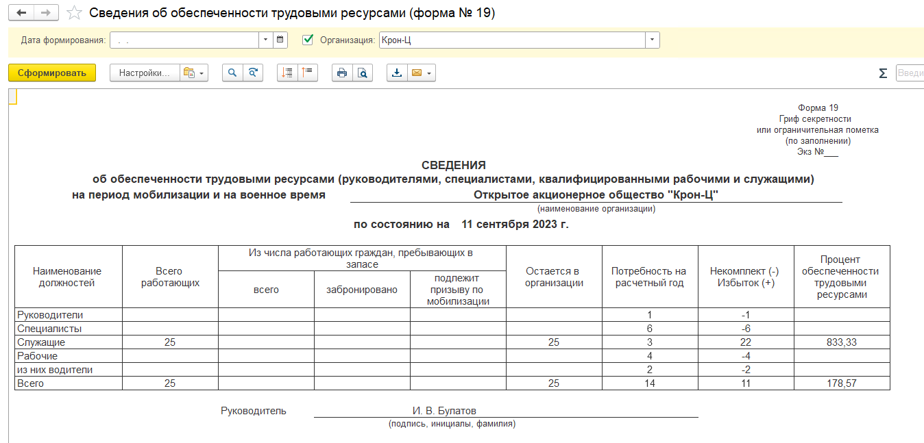 Форма № 19 – это Сведения об обеспеченности трудовыми ресурсами на период мобилизации и военного времени. Помимо данных по всем сотрудникам и их статусу (бронирование в запасе или нет), в них указываются: