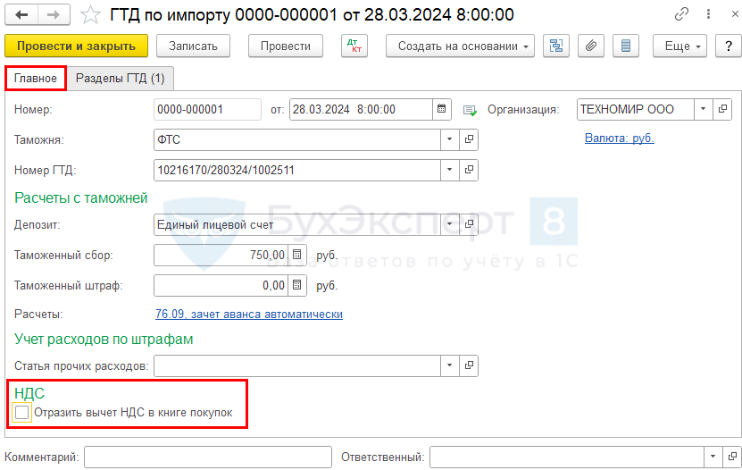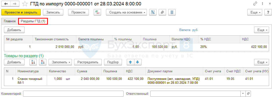 Вкладка Разделы ГТД заполняется на основе данных документа Поступление (акт, накладная, УПД).