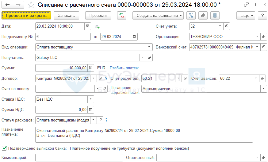 Документ Списание с расчетного счета заполняется по такому же алгоритму, как и при .
