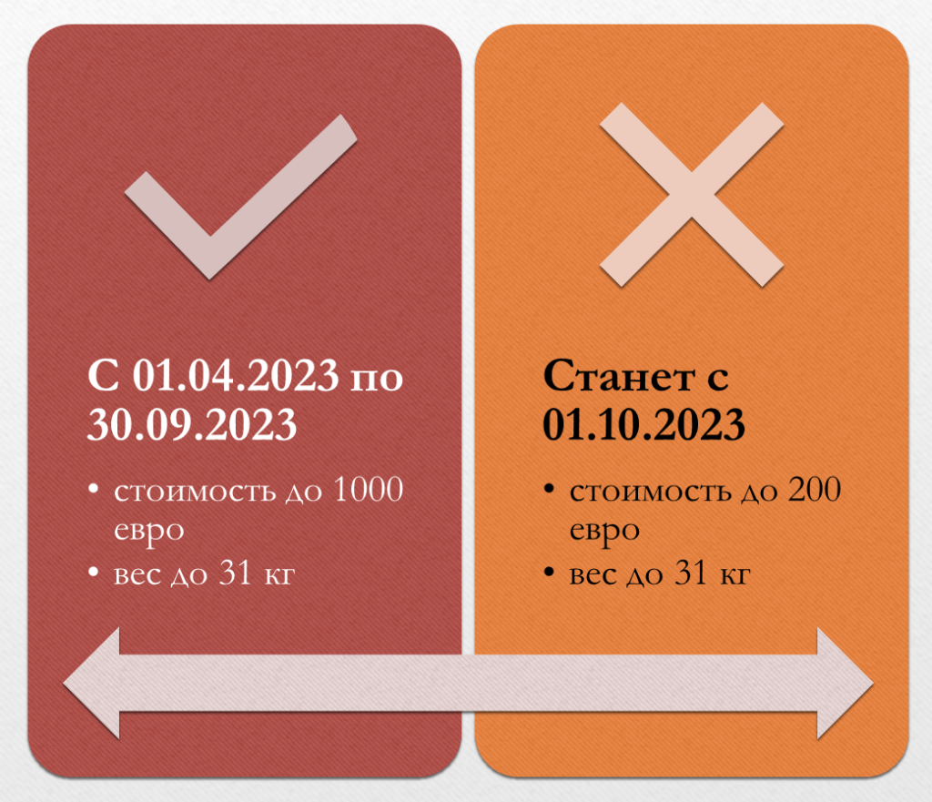 - для ввоза через сухопутную или морскую границу – порог в 500 евро стоимости и 25 кг веса (до 31 марта 2023-го это 1000 евро и 31 кг);