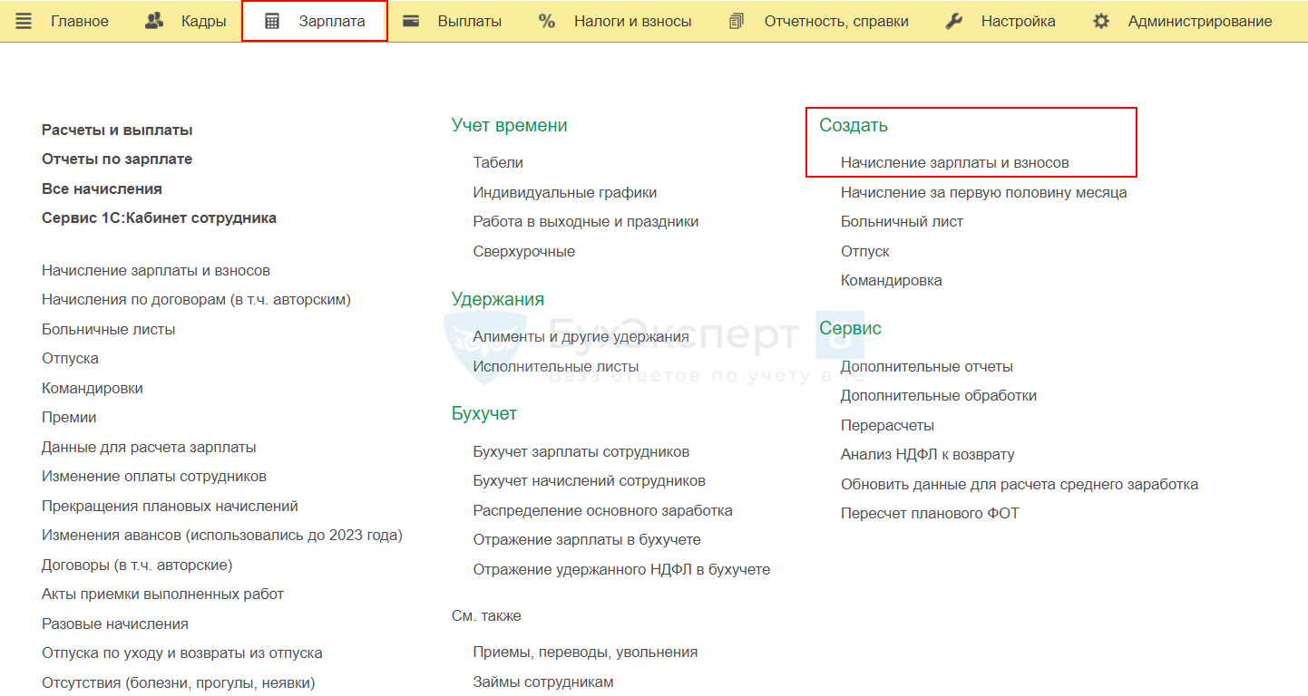Чтобы начислить взносы по ГПХ договорам в 2023 году в1С:ЗУП ред. 3.1, зайдите в меню Зарплата и в разделе Создать выберите Начисление зарплаты и взносов.