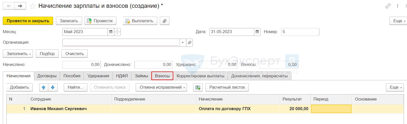 Как начислить взносы по ГПХ договору 1С:ЗУП ред. 3.1