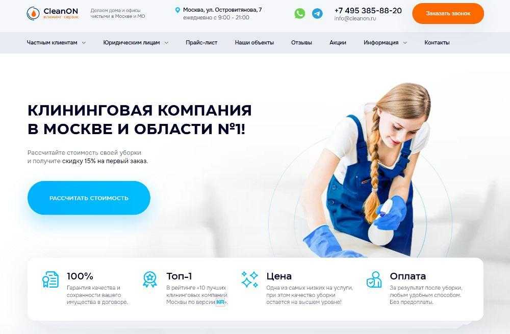 Одна из компаний, которая по праву заняла лидирующее место в рейтинге, это сервис CleanOn. Он сотрудничает с частными лицами и коммерческими организациями, выполняет уборку на постоянной основе или разово, справляется со стандартными задачами вроде генеральной уборки и со сложным клинингом, например, устранением последствий пожара, наводнения.