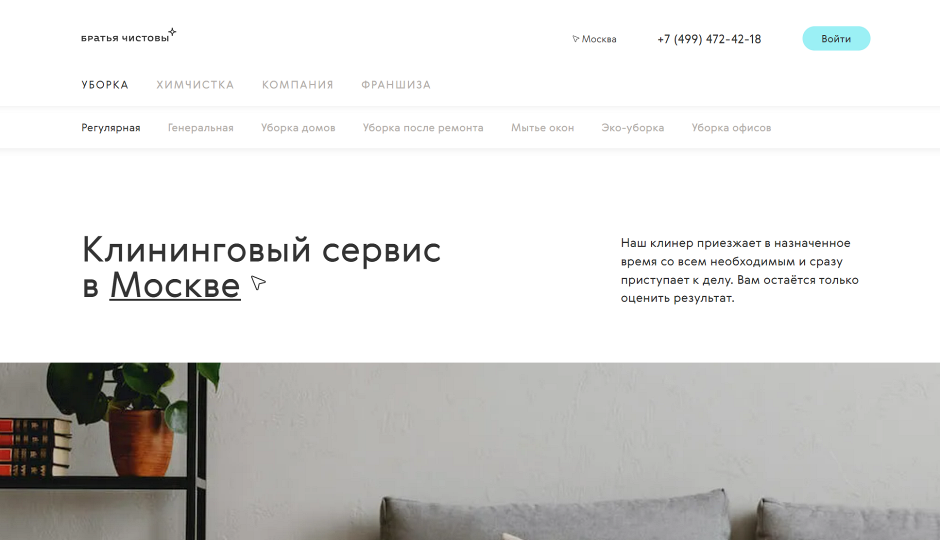 Клининговая компания «Братья Чистовы» оказывает услуги уборки квартир, коттеджей, офисов, а также занимается профессиональной химчисткой мебели и постельных принадлежностей. Одним из главных преимуществ сервиса является возможность выбора видов клининга – от экспресс до полноценного генерального.