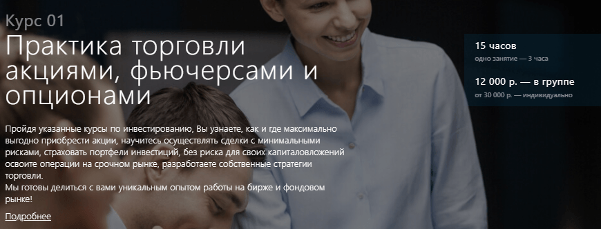 Новичкам отлично подойдет “Курс 01: Практика торговли акциями, фьючерсами и опционами” за 12 000 рублей.