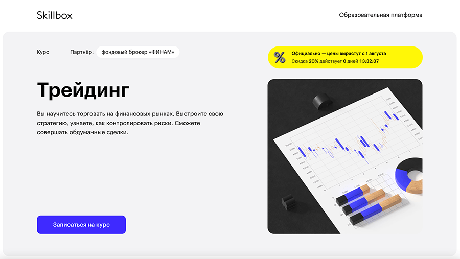 Курс по трейдингу от образовательной платформы Скиллбокс и брокера ФИНАМ. Здесь вы научитесь анализировать рынки, выстраивать стратегии по инвестициям, контролировать риски и т. д.