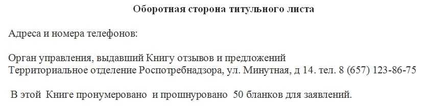 Вторая часть документа ─ оборотная сторона титульной страницы ─ сведения о контролирующих и надзорных органах (их название, адрес и телефон на тот случай, если клиент надумает лично обратиться в эти структуры), а также количество страниц, отведенных непосредственно под мнение посетителей.