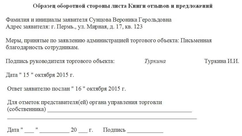 - В саму книгу отзывов и предложений должна быть внесена запись о принятых мерах (на оборотной стороне листа с мнением посетителя).