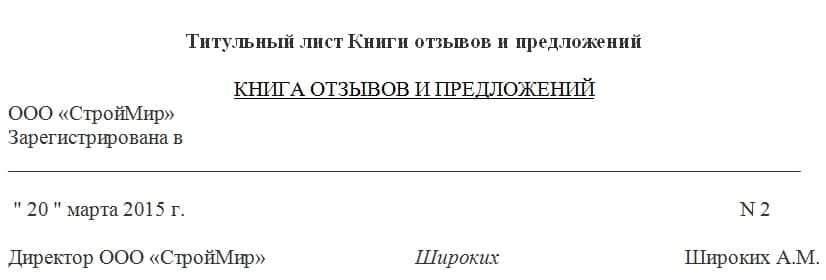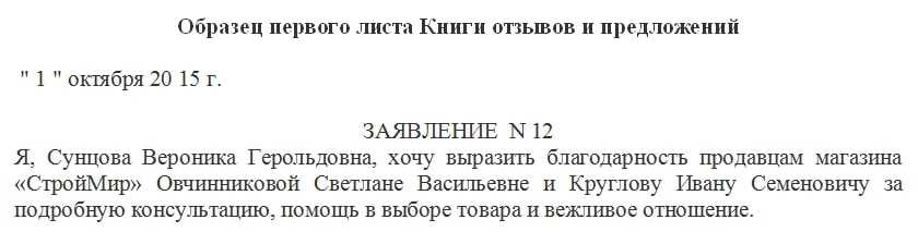 Здесь приводится пример заполнения книги посетителем. На лицевой стороне листа пишется собственно отзыв/предложение, с обязательным указанием его даты.