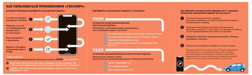 Сейчас с помощью мобильной электронной подписи можно удаленно получить государственные услуги, оформить коммерческие сделки и зарегистрировать бизнес. Так, «Госключ» позволяет заключить договор с оператором мобильной связи, в том числе в дистанционном формате сменить оператора и оформить eSim, заключить договор купли-продажи автомобиля на портале «Госуслуг», подписать документы для регистрации бизнеса на сайте Федеральной налоговой службы (ФНС). Кроме того, пользователи могут подписать договор на платное обучение с вузом в рамках суперсервиса «Поступление в вуз онлайн», подтвердить свой аккаунт на маркетплейсе, подписать документы, отправленные себе в приложение с портала «Госуслуг» (например, договор аренды жилья, акт о выполнении работы). Также с его помощью можно исправить технические ошибки (опечатки, грамматические или арифметические ошибки) в сведениях в Едином государственном реестре недвижимости, подать заявление о расторжении брака в случае обоюдного согласия супругов и отсутствия несовершеннолетних детей, подписать документы при оформлении ипотечного договора и при заключении сделок с недвижимостью. Переходят государственные услуги в онлайн благодаря национальному проекту «Цифровая экономика».