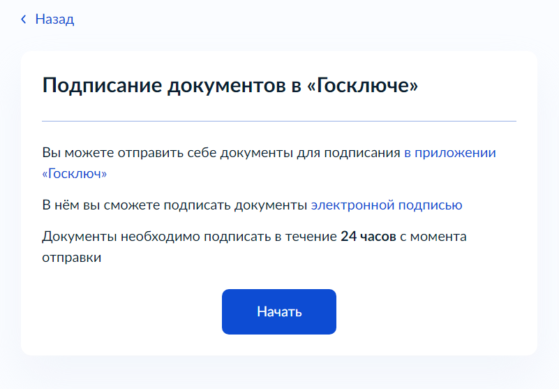 - Нажмите “Начать” для отправки документов на подпись в приложение Госключ;