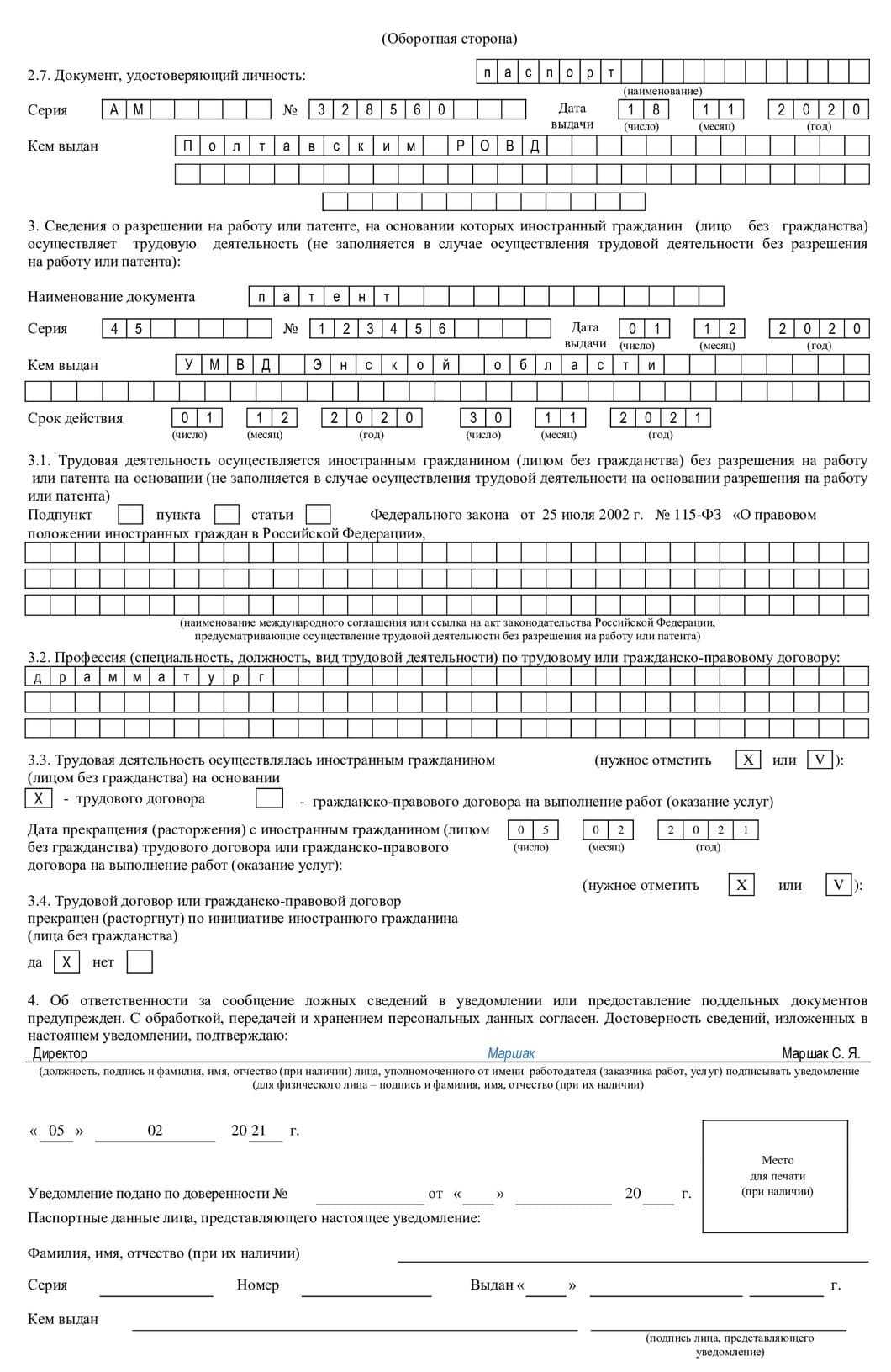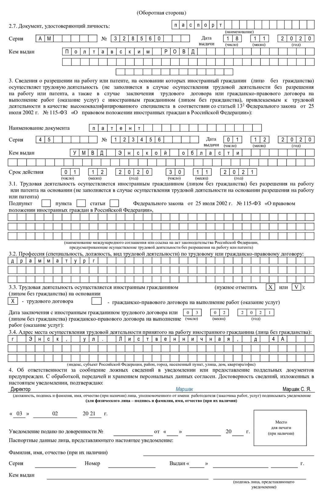 Если подаете сведения на бумаге, то возьмите с собой в МВД не только заполненное и при необходимости прошитое уведомление, но и документы, удостоверяющие личность и полномочия работодателя. Например, это паспорт и доверенность.