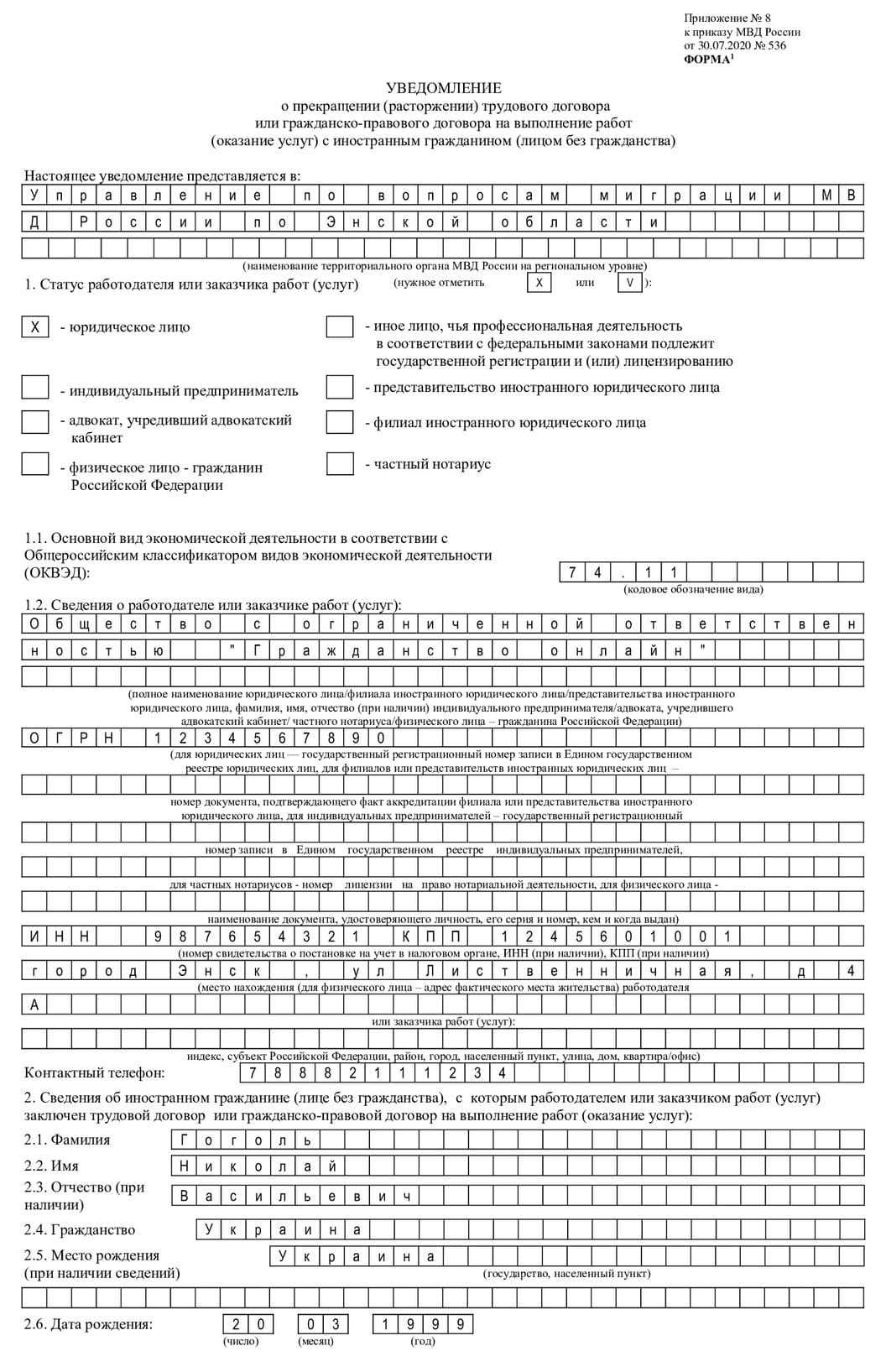 Пример заполнения формы о приеме на работу иностранного гражданина
