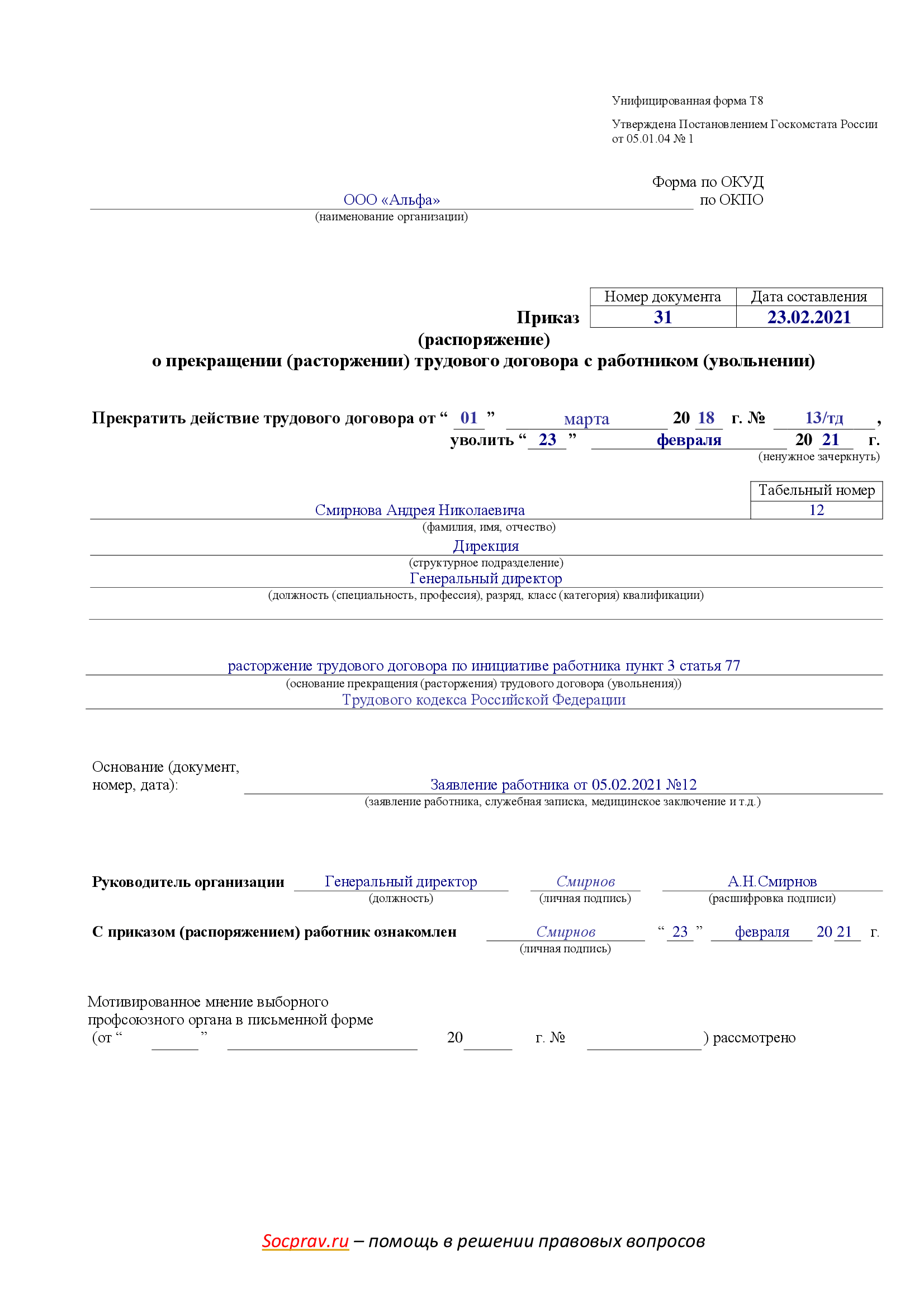 Это же относится и к приказу об освобождении самого себя от должности (если на поданное заявление члены совета акционеров никак не отреагировали), и к трудовой книжке (ст. 66 ТК). В трудовой книжке необходимо сделать ссылку на ст. 77 ТК.