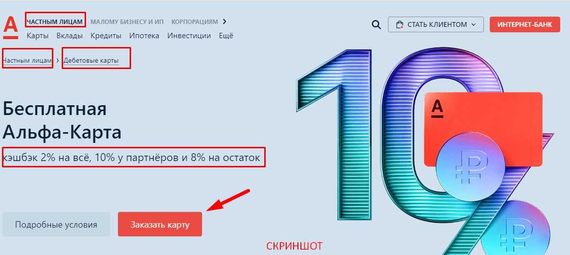 - Найдите на офсайте Альфа-Банка раздел «Дебетовые карты», выберите в нем Альфа-Карту и нажмите на кнопку «Заказать карту».